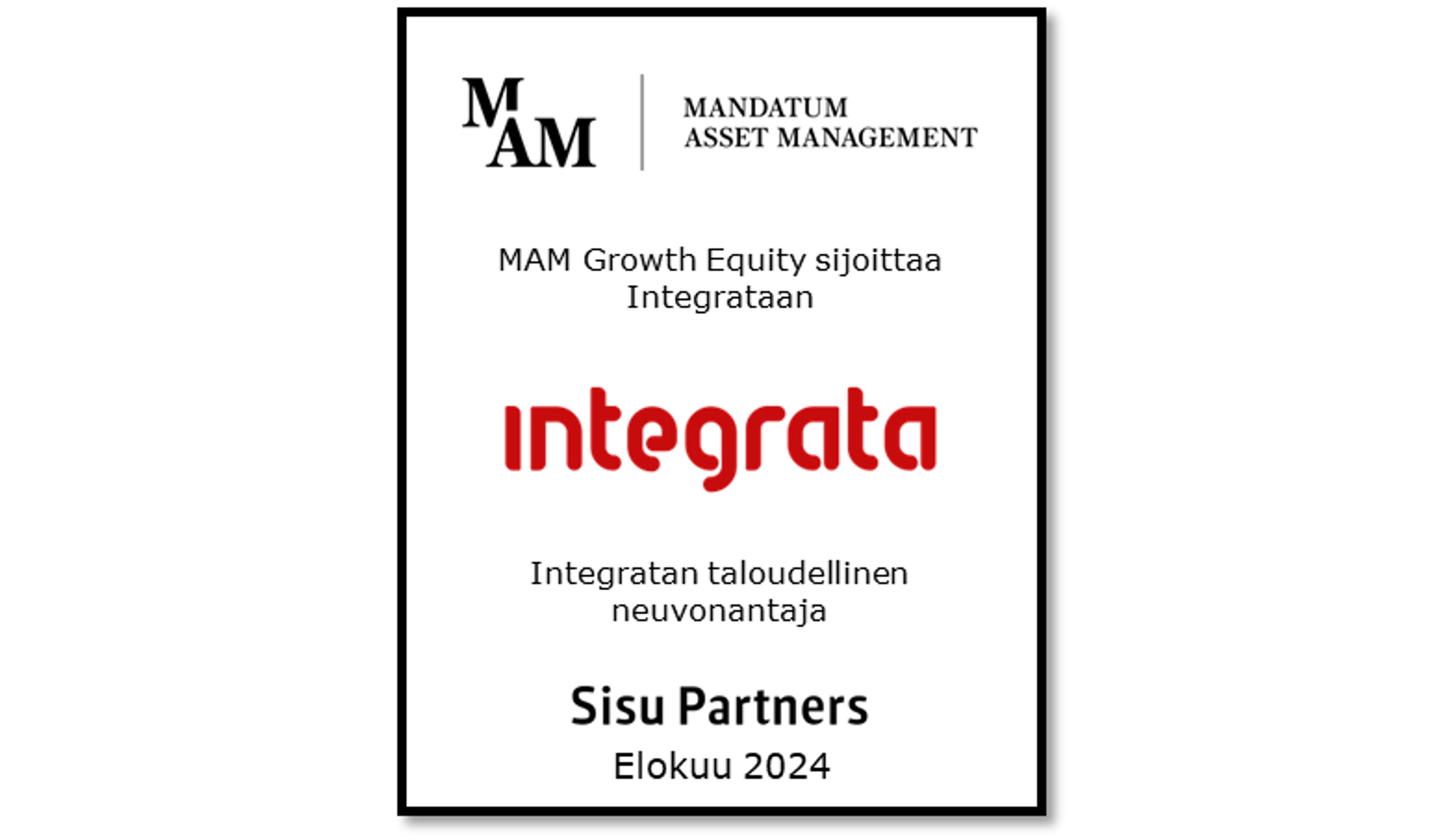Integrata on saanut merkittävän kasvupanostuksen 15.8.2024 MAM Growth Equityn kanssa solmitussa transaktiossa. Kasvupanostuksella tuetaan Integratan kansainvälistymistä ja teknologiaratkaisujen kehittämistä.