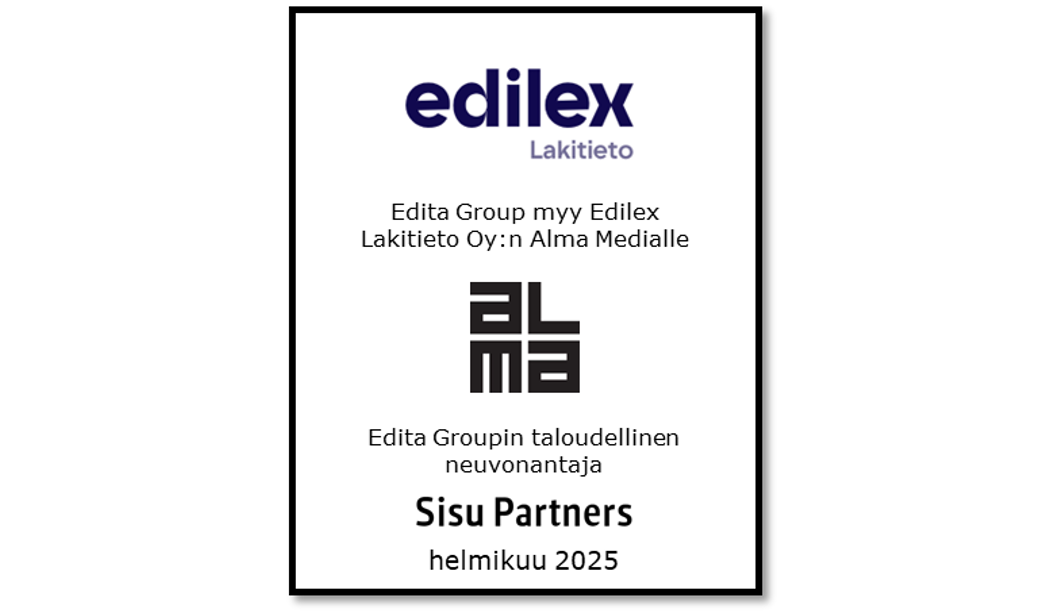 Edita Group Oyj on myynyt Edilex Lakitieto Oy -tytäryhtiönsä osakekannan Alma Media Oyj:lle. Järjestelyssä Suomeen muodostuu laaja-alainen juridisten sisältöpalvelujen tarjoaja. Edilex Lakitieto Oy liittyy osaksi Alma Marketplaces -segmentin Legal Insights -yksikköä, jonka palvelutarjonta koostuu digitaalisista juridisista ratkaisuista. Osapuolten tuote- ja palveluvalikoimat täydentävät hyvin toisiaan, ja yhdessä ne tarjoavat Suomen kattavimmat juridiikan sisältöpalvelut. Sisu Partners toimi Edita Groupin taloudellisena neuvonantajana transaktiossa.