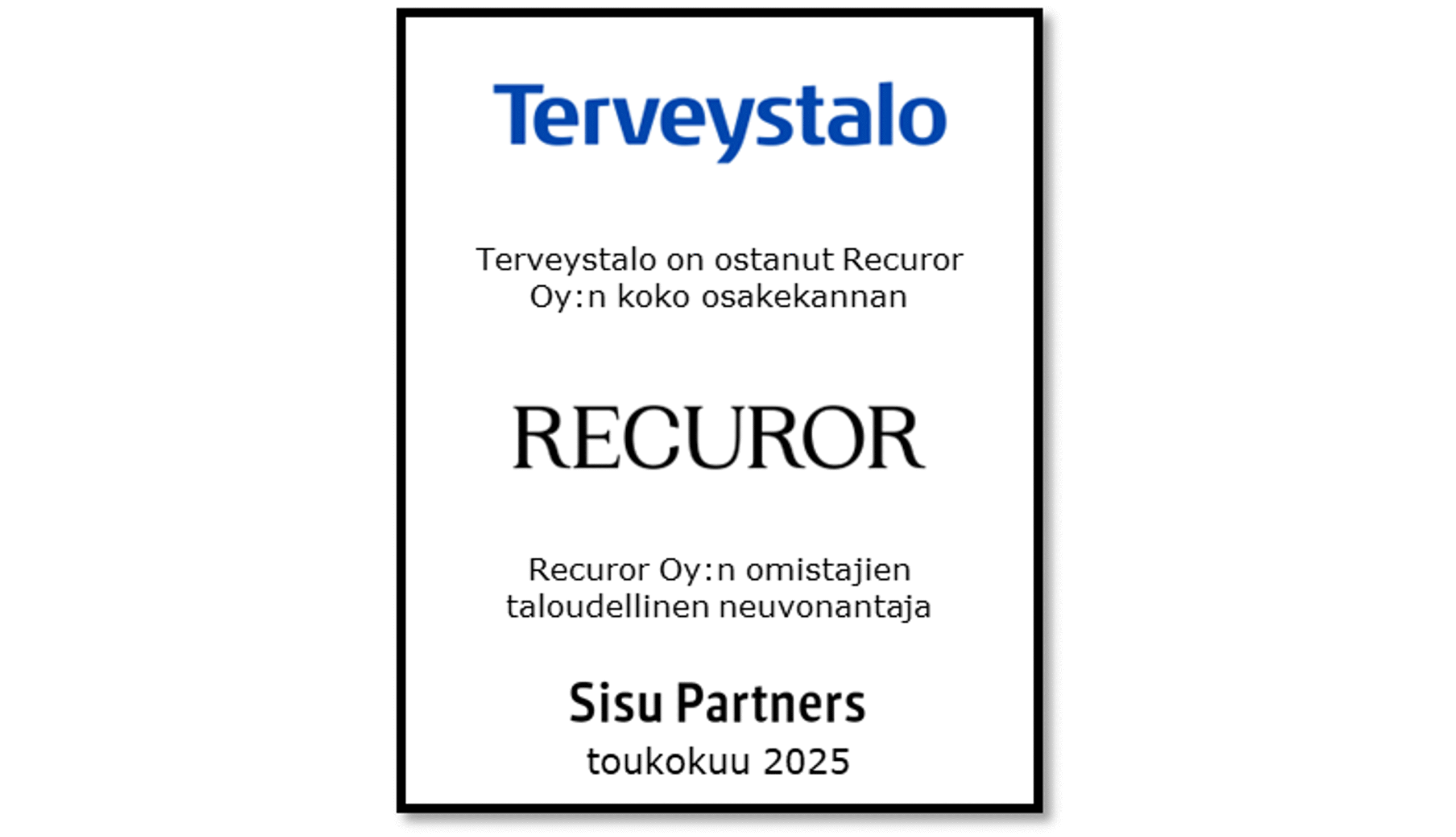 Terveystalo ostaa Recuror Oy:n 30.5.2025 allekirjoitetulla sopimuksella. Yrityskauppa vahvistaa Terveystalon mielenterveyden palveluja erityisesti Turussa ja Helsingissä sekä digitaalisen kanavan kautta valtakunnallisesti.
